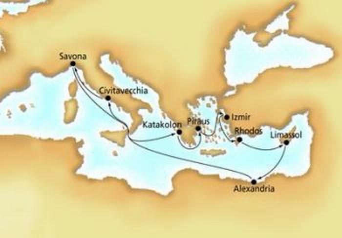 Unsere Schiffsreise führt uns von Italien aus nach Griechenland, in die Türkei, nach Rhodos, Zypern, Ägypten und wieder zurück nach Italien