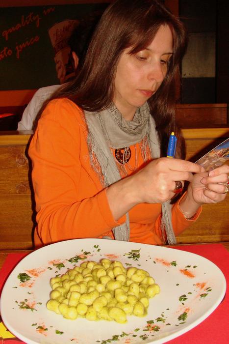 Ansichtskarten schreiben in der Stammpizzeria beim Hotel ums Eck.