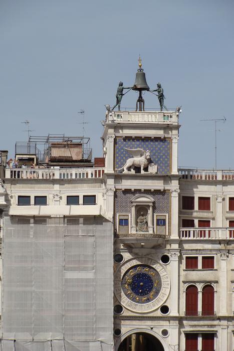 | Der Uhrenturm (Torre dell'Orologio 1496 - 1499) von Mauro Codussi. Die astronomische Uhr mit ihrem Zifferblatt aus Lapislazuli zeigt die Mond- und Sonnenphasen und die Tierkreiszeichen. |